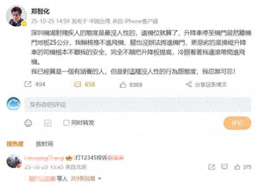10月25日,歌手郑智化在社交平台发帖说,他在深圳宝安机场登机时碰上大麻烦,他坐轮椅,机场的升降平台和飞机门之间差了25厘米,轮椅根本对不上,他只能自己想办法,最后是连滚带爬上去的,旁边工作人员看着,也没伸手,也没开口。同一天,另一位歌手李琛在评论区说,他也碰上过这样的事,不少人跟着讲自己的经历,他们不是少数人,只是平时没人听他们说,这次因为郑智化是公众人物,事情才被闹大。